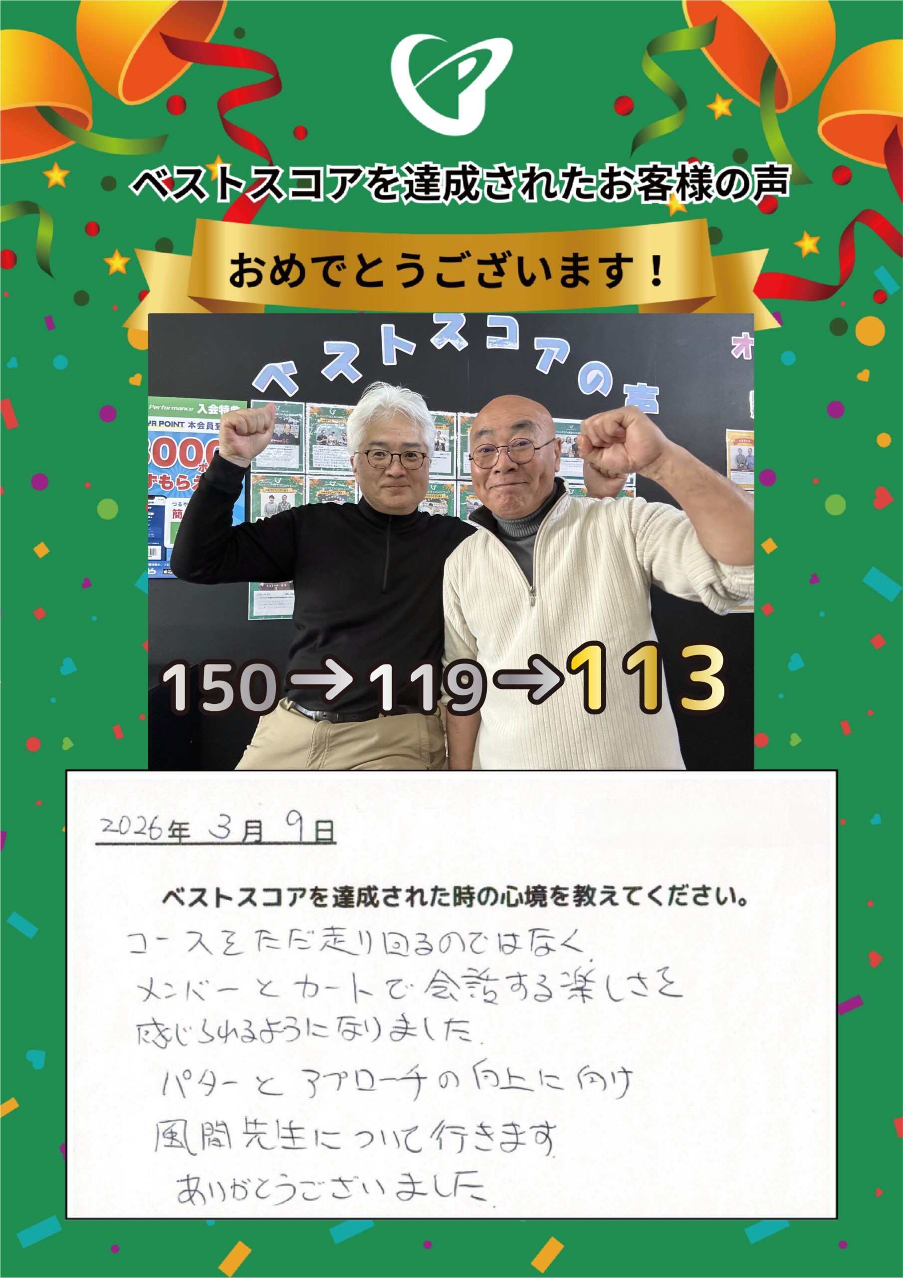 Kさま 達成日:3/1 入会時のベストスコア:99…続きを読む