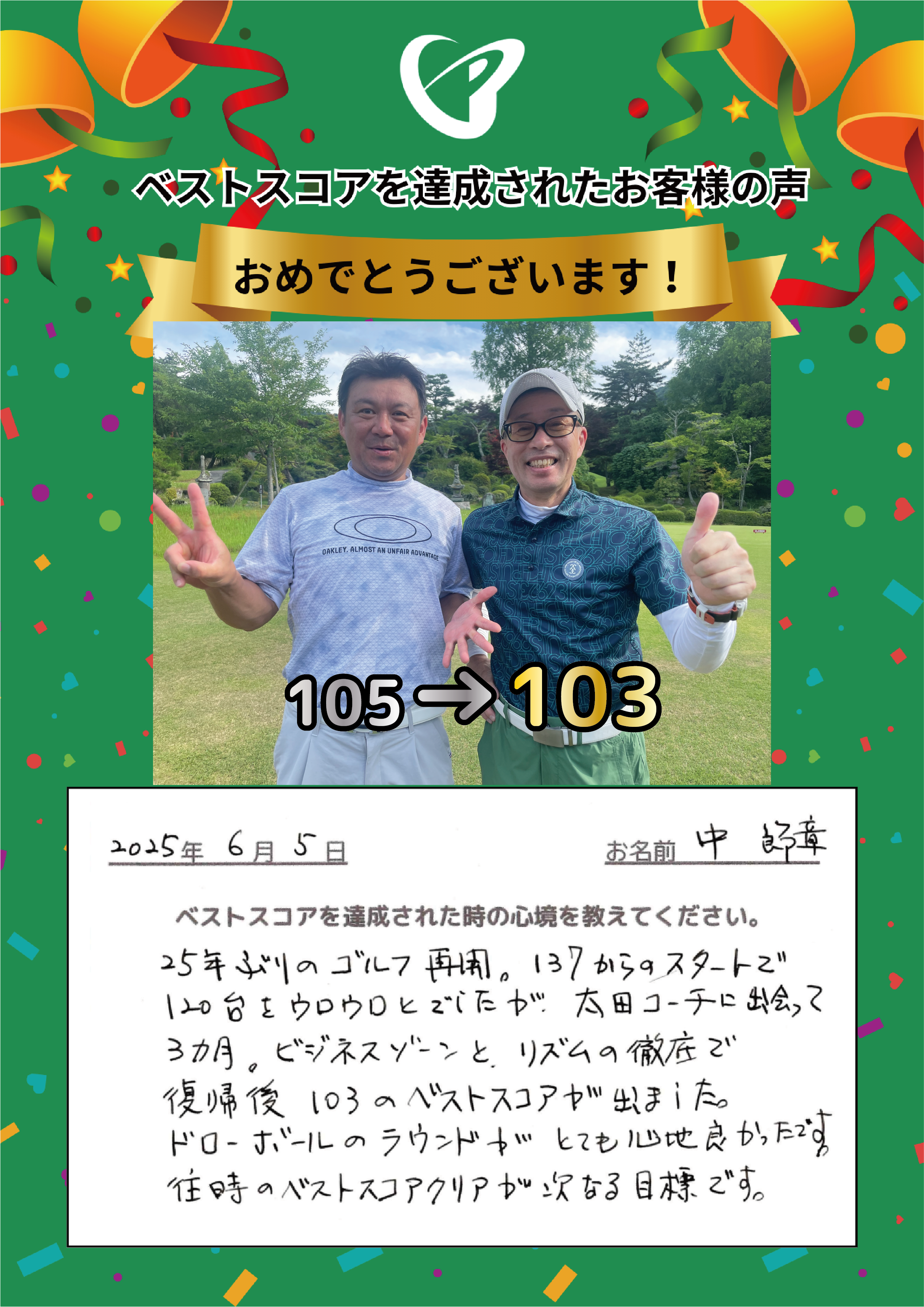Nさま 達成日:6/5 入会時のベストスコア:10…続きを読む