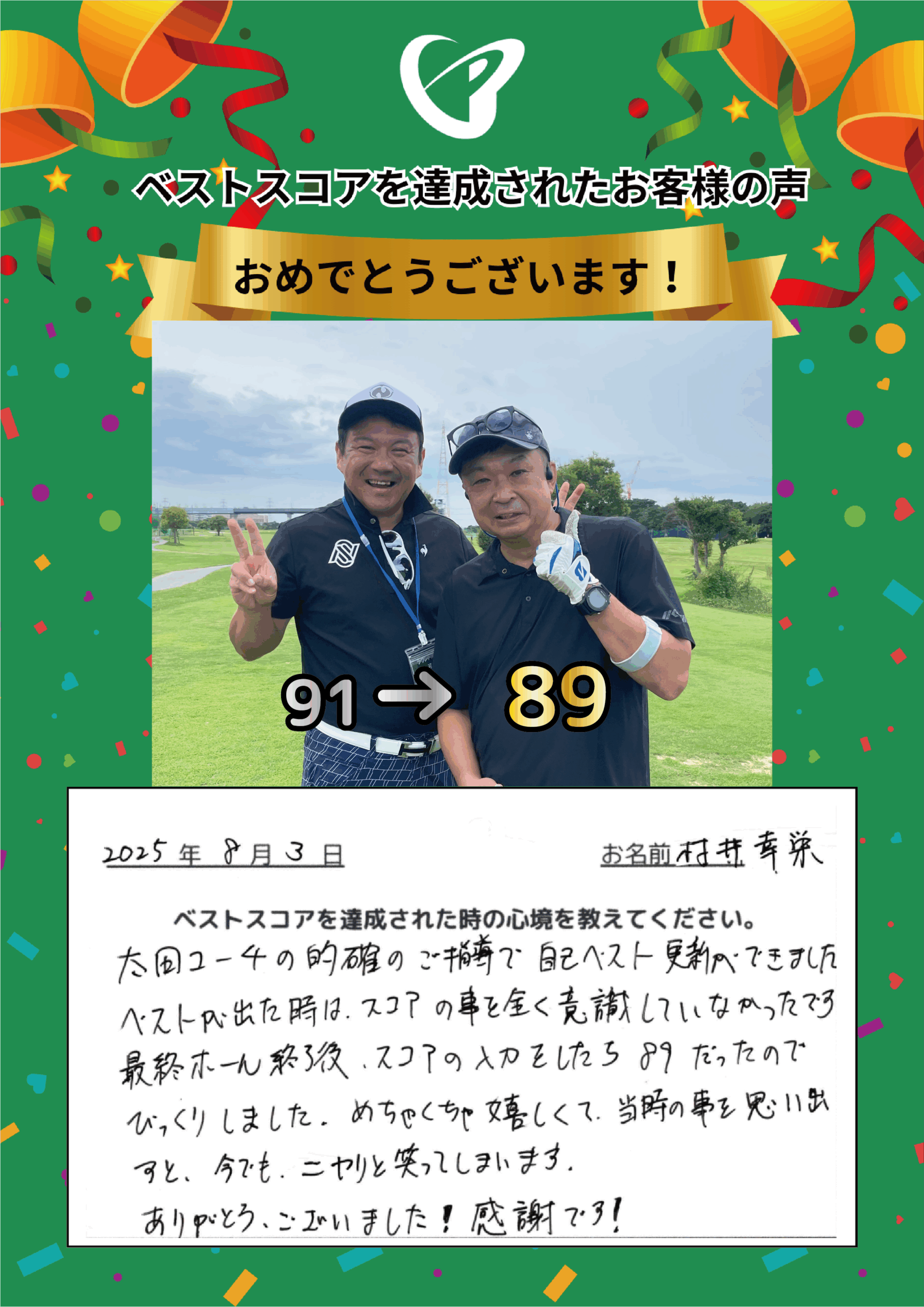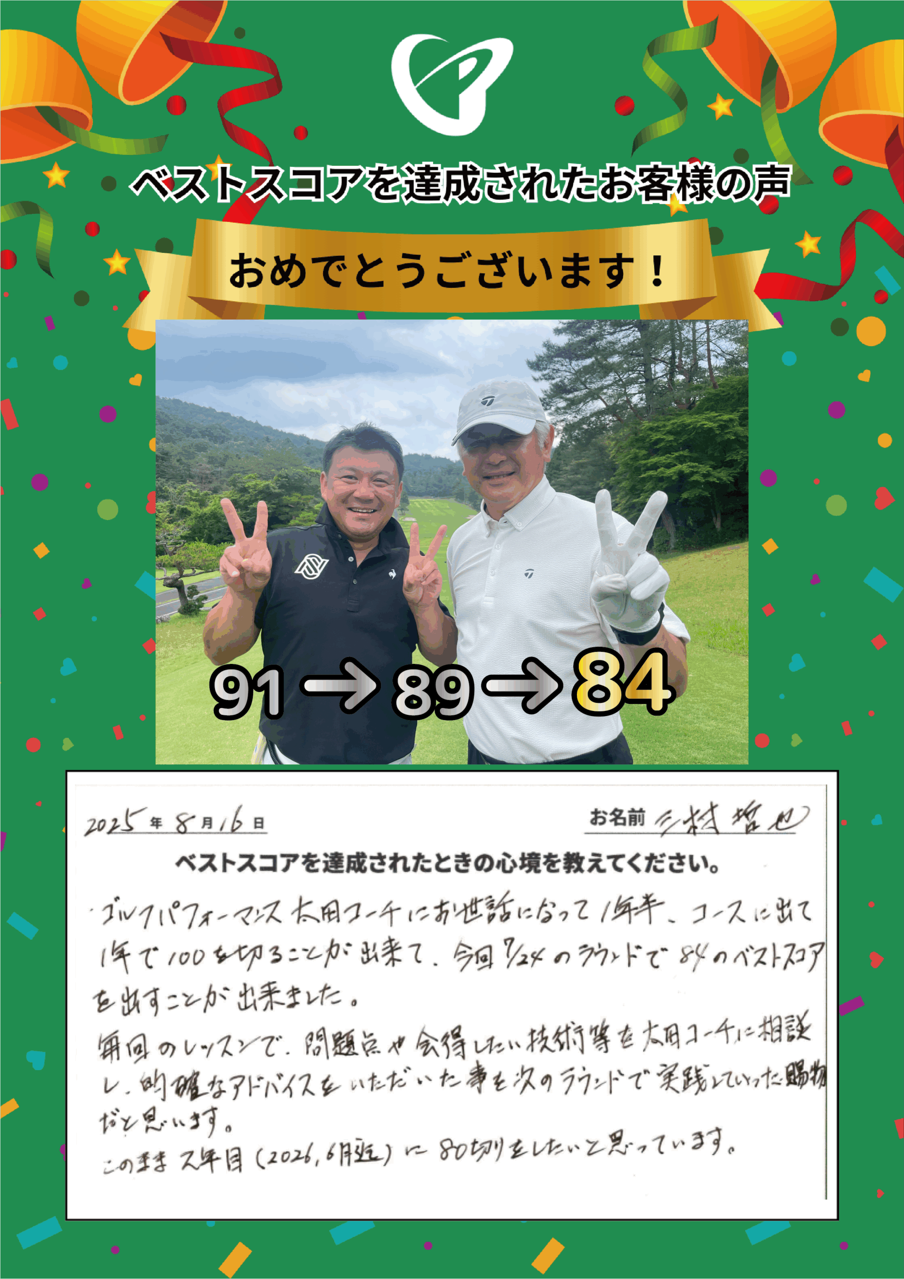 Mさま 達成日:8/3 入会時のベストスコア:91…続きを読む