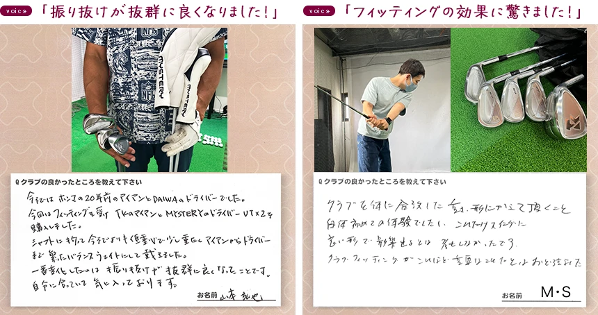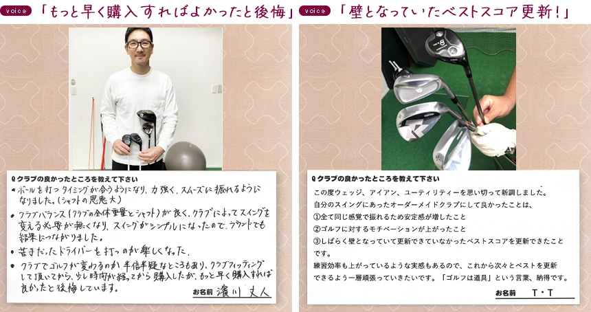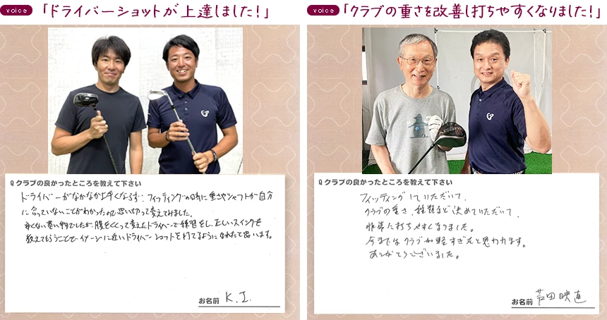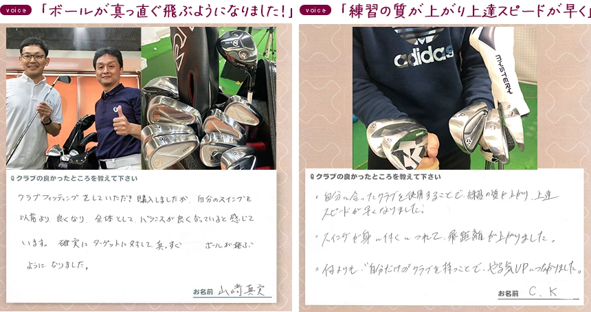 自分が気になっていた以上にクラブの重量の不具合を見つけてくださりありがとうございました。新しいクラブは方向性がよくなりました。また機会があればよろしくお願いいたします。