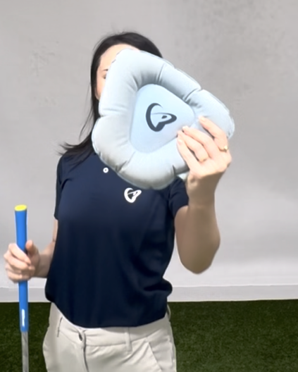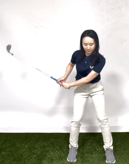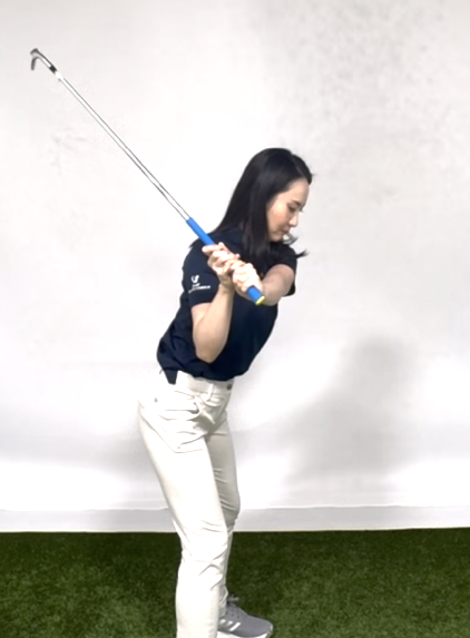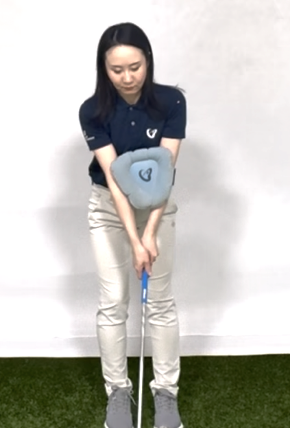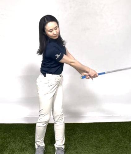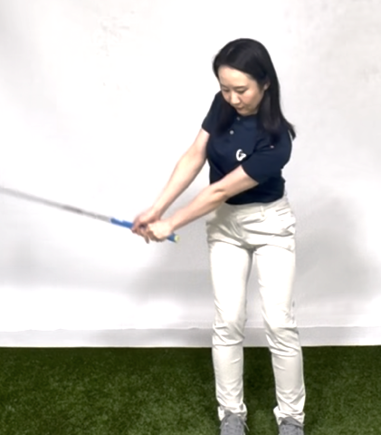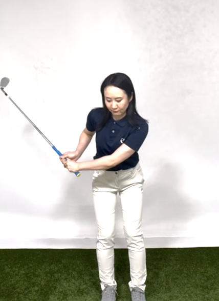 この練習により、手先だけでクラブを上げるクセがなくなり、体の回転でスイングする感覚を身につけられます。
