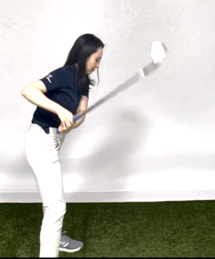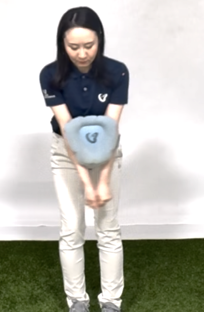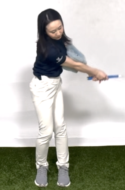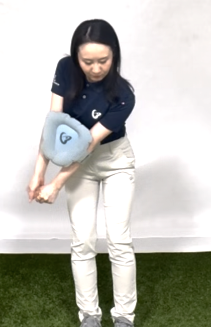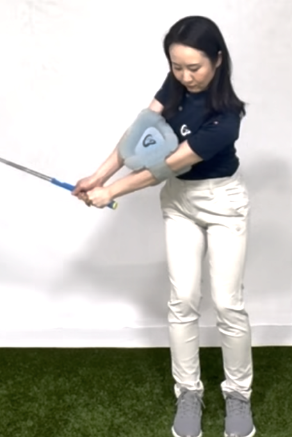 2.胸と肘を固定した状態で、体の回転だけでスイングします。