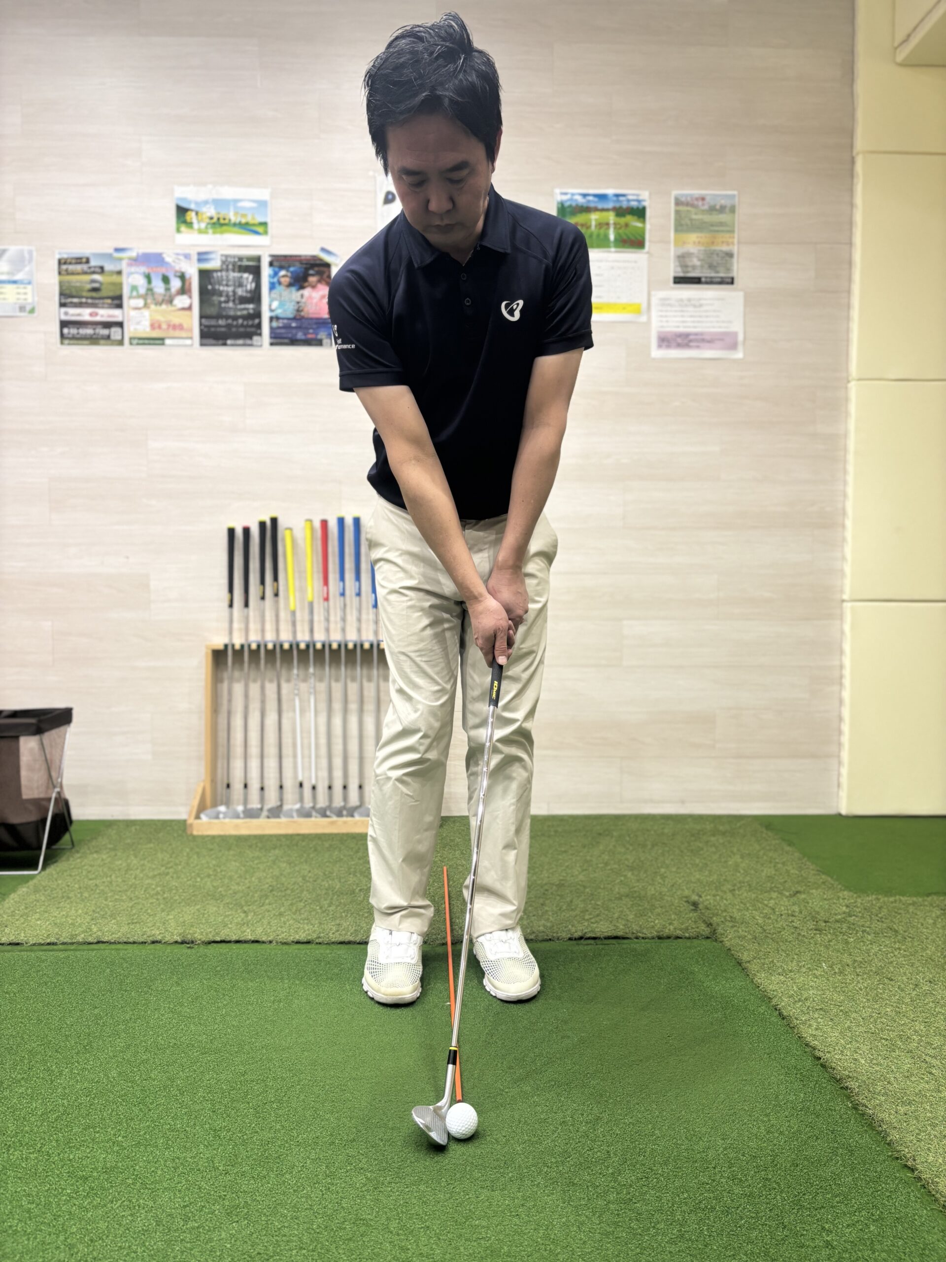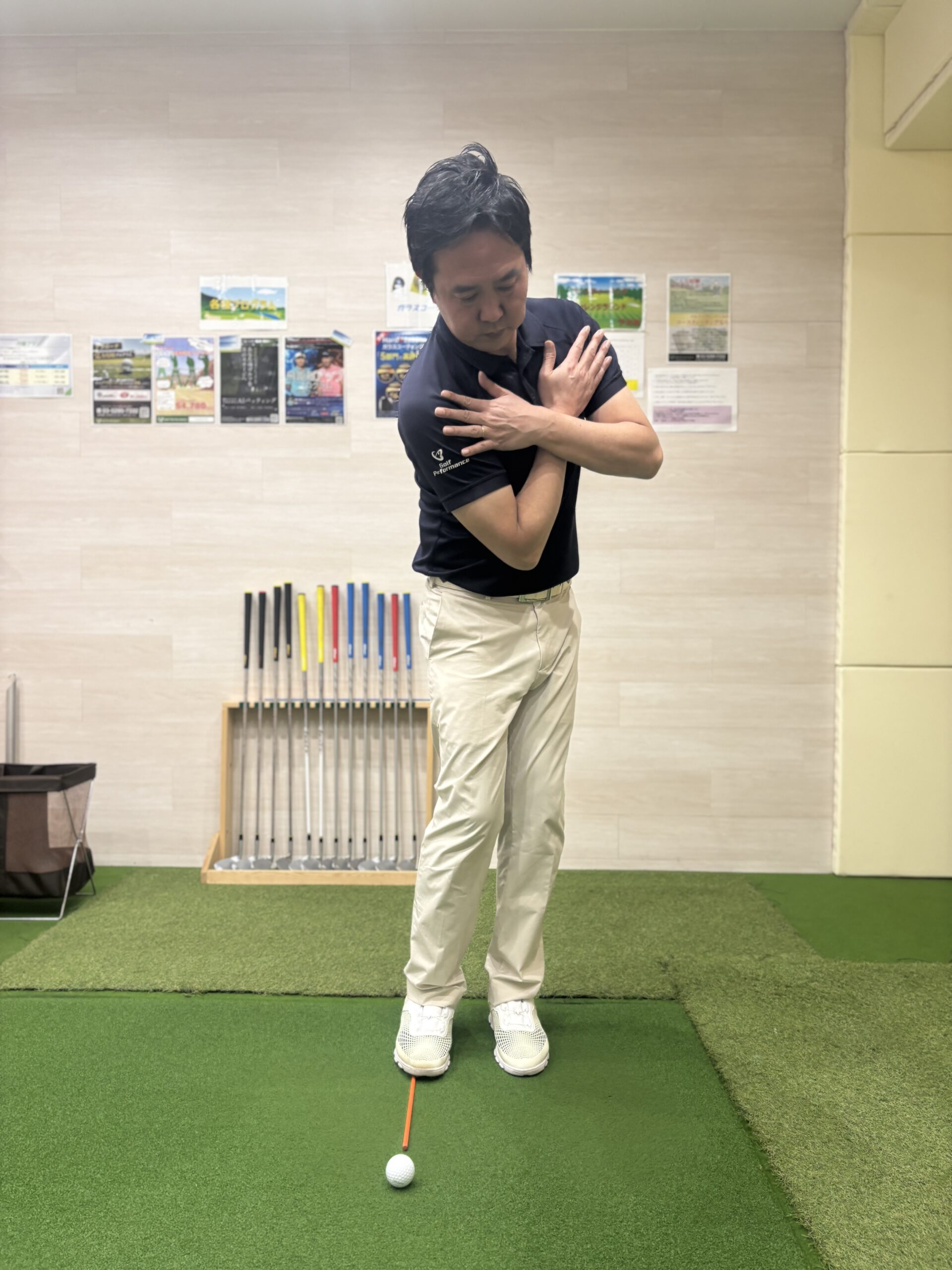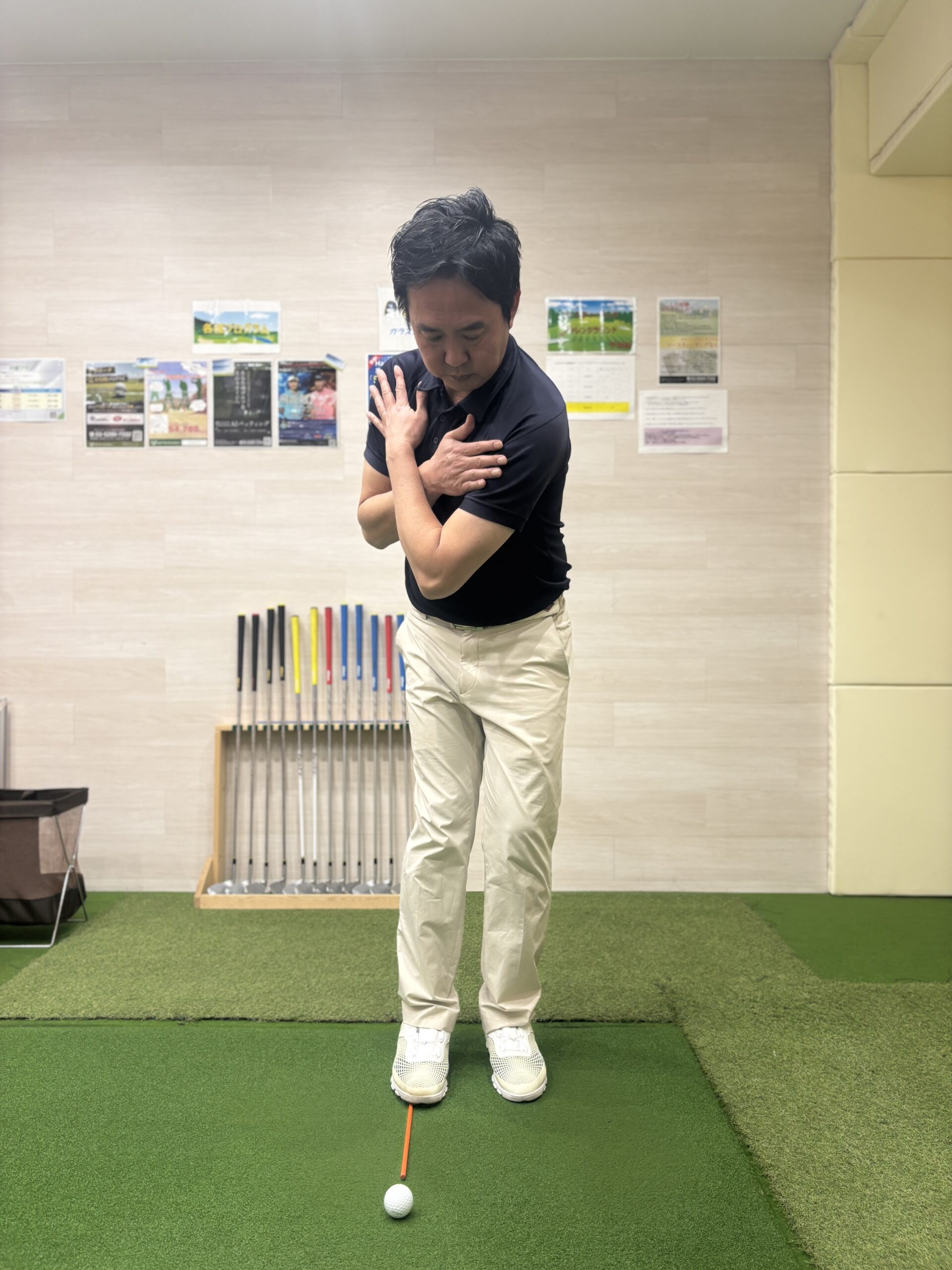 ランニングアプローチでは胸の真ん中より少し右側にセットします。