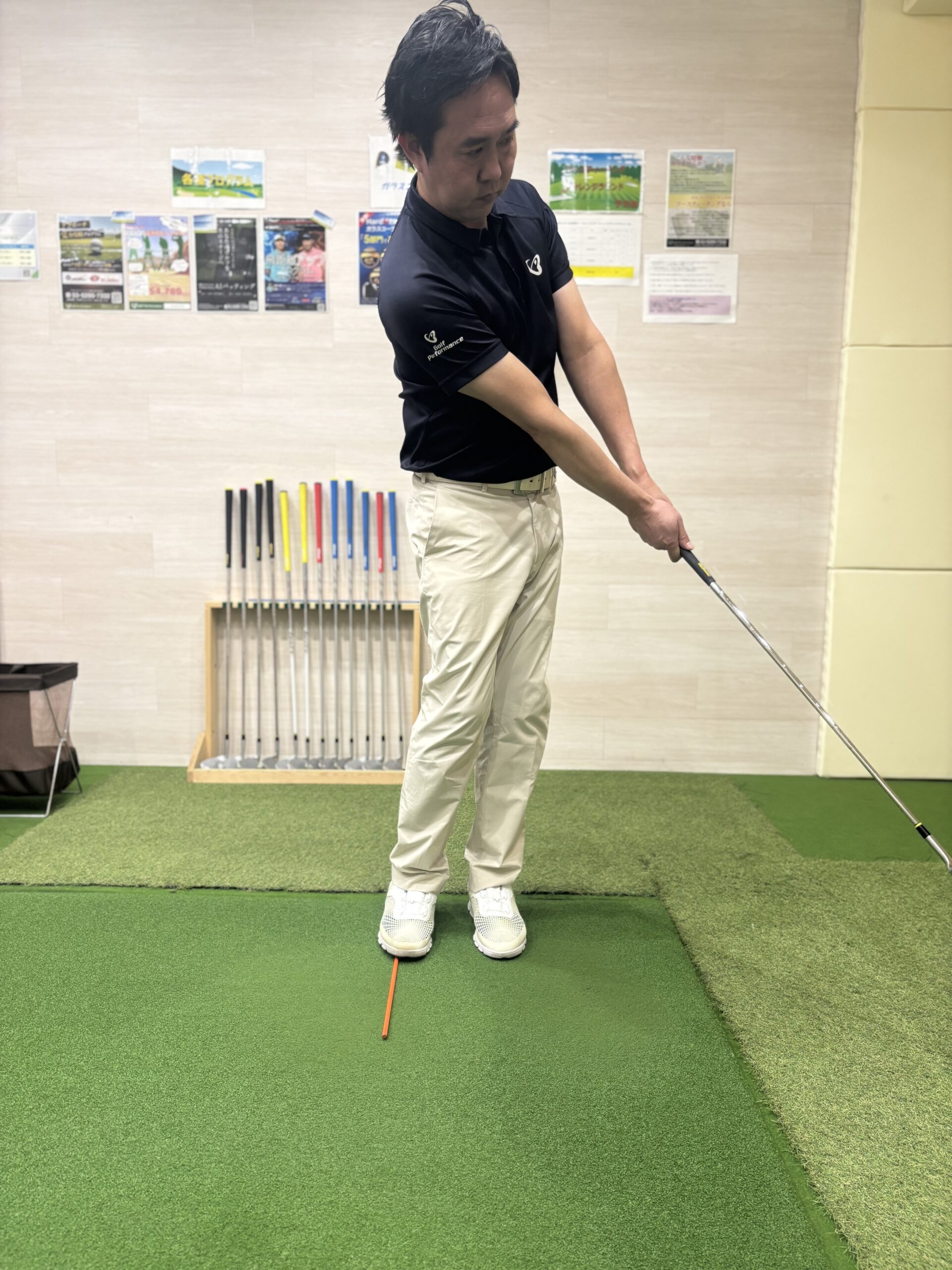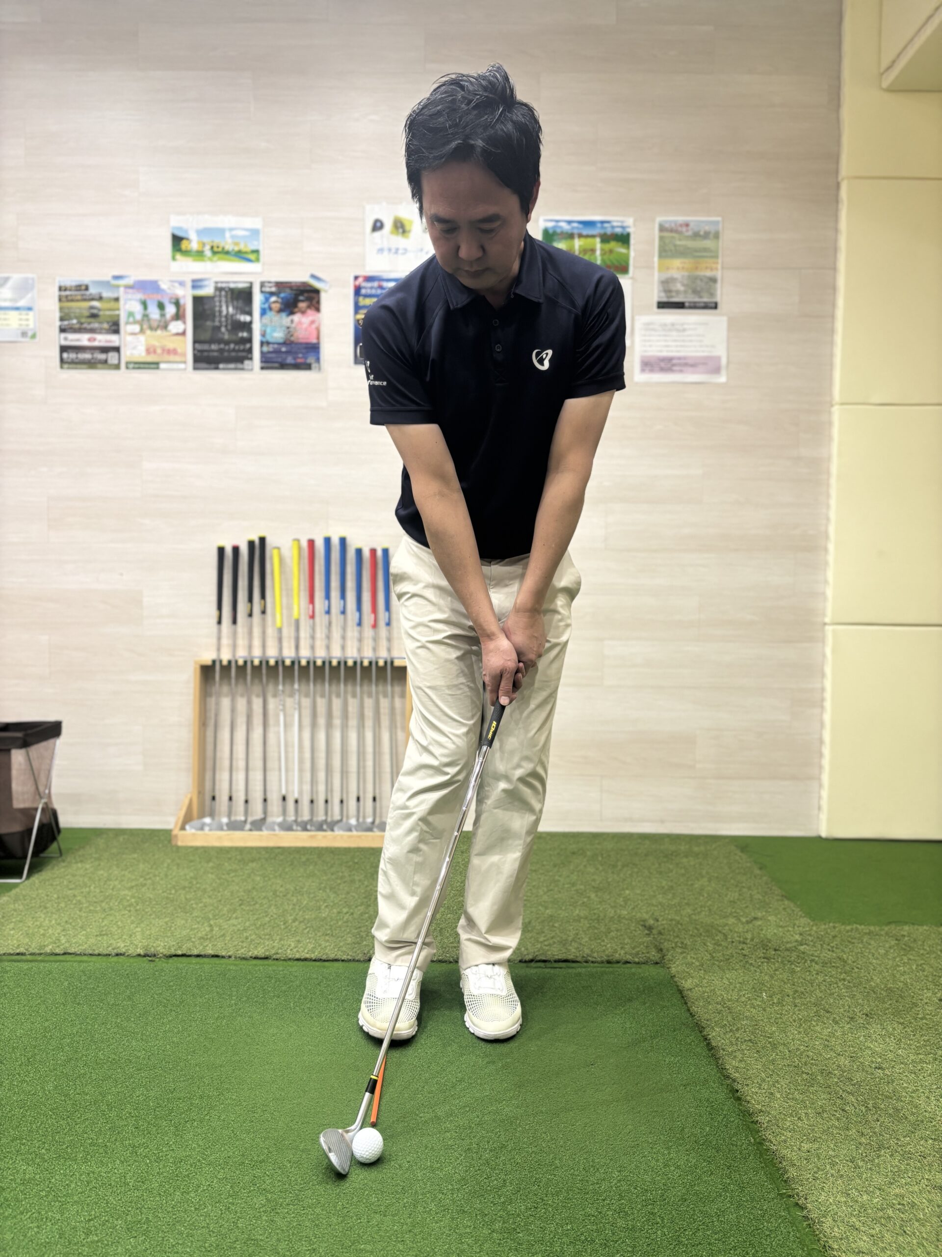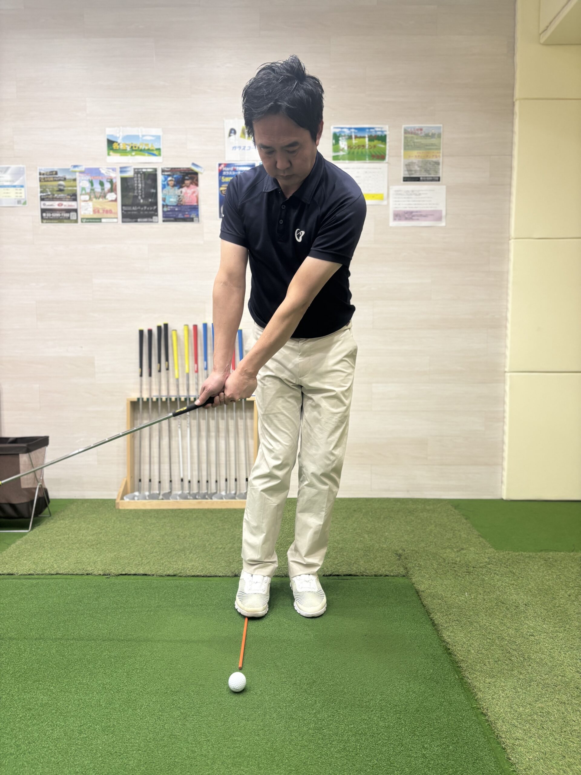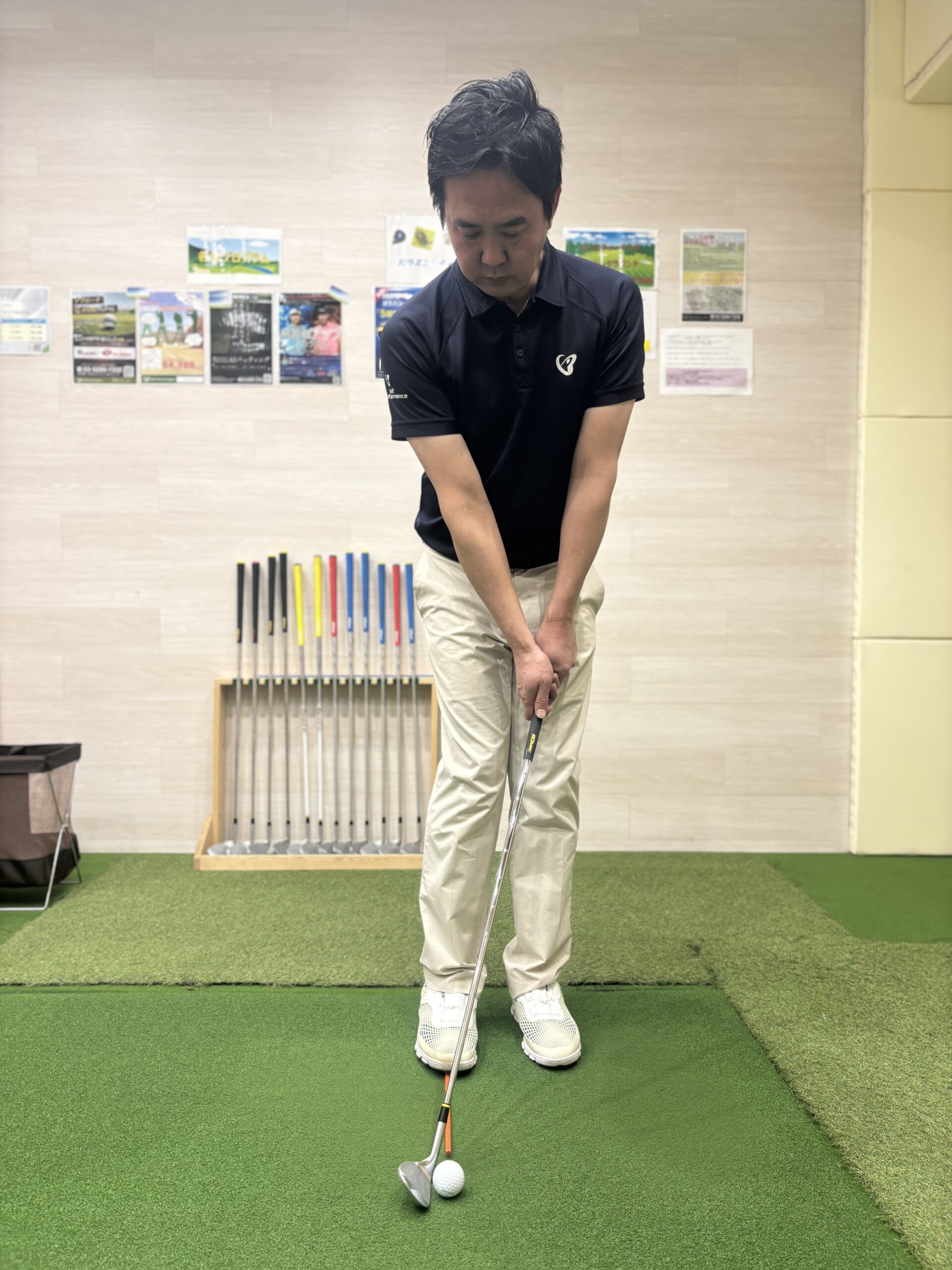 ランニングアプローチでは胸の真ん中より少し右側にセットします。