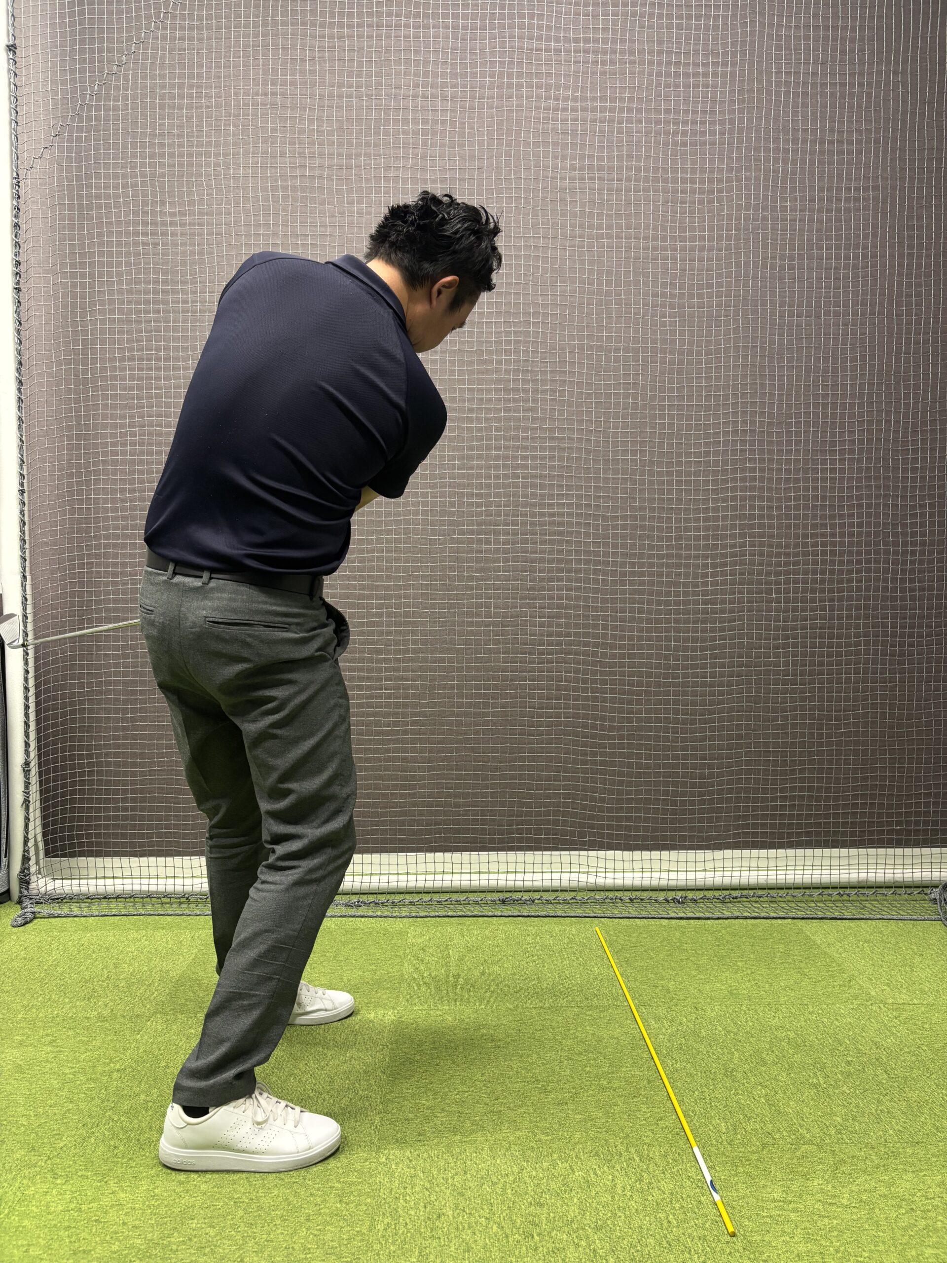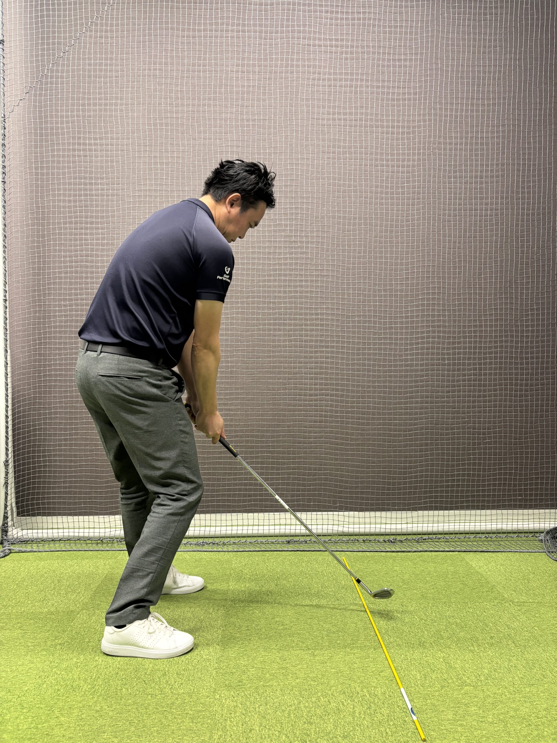この状態でボールを打つと、クラブ軌道がアウトサイドインになりやすく、カット軌道でインパクトを迎え、スライスが発生します。