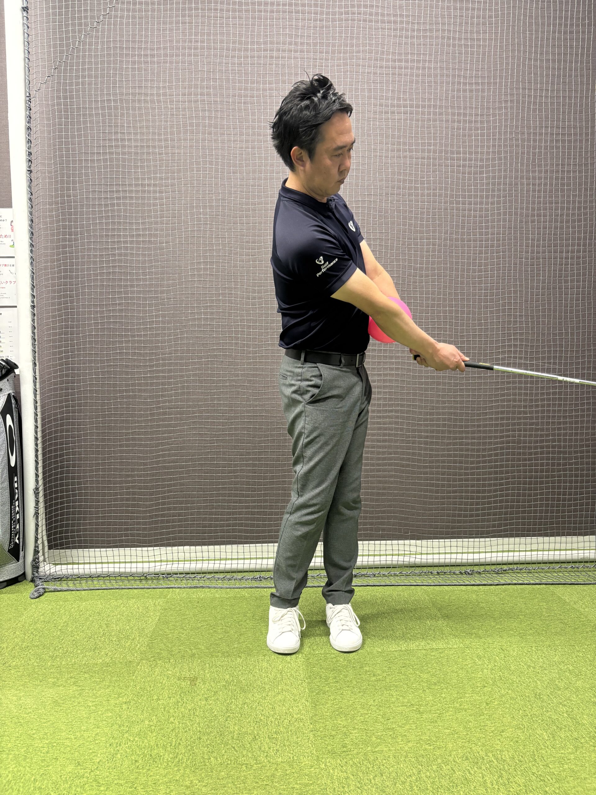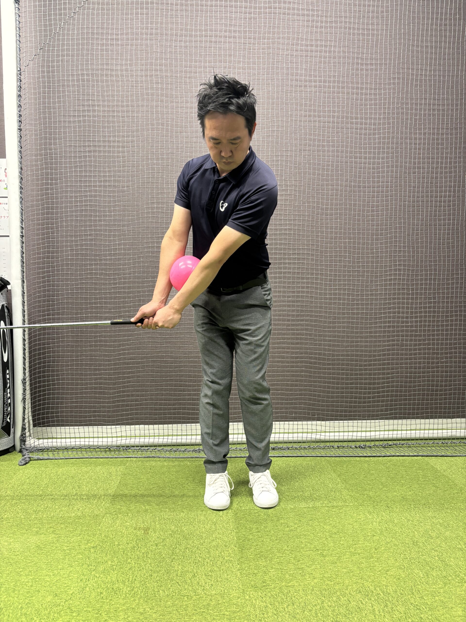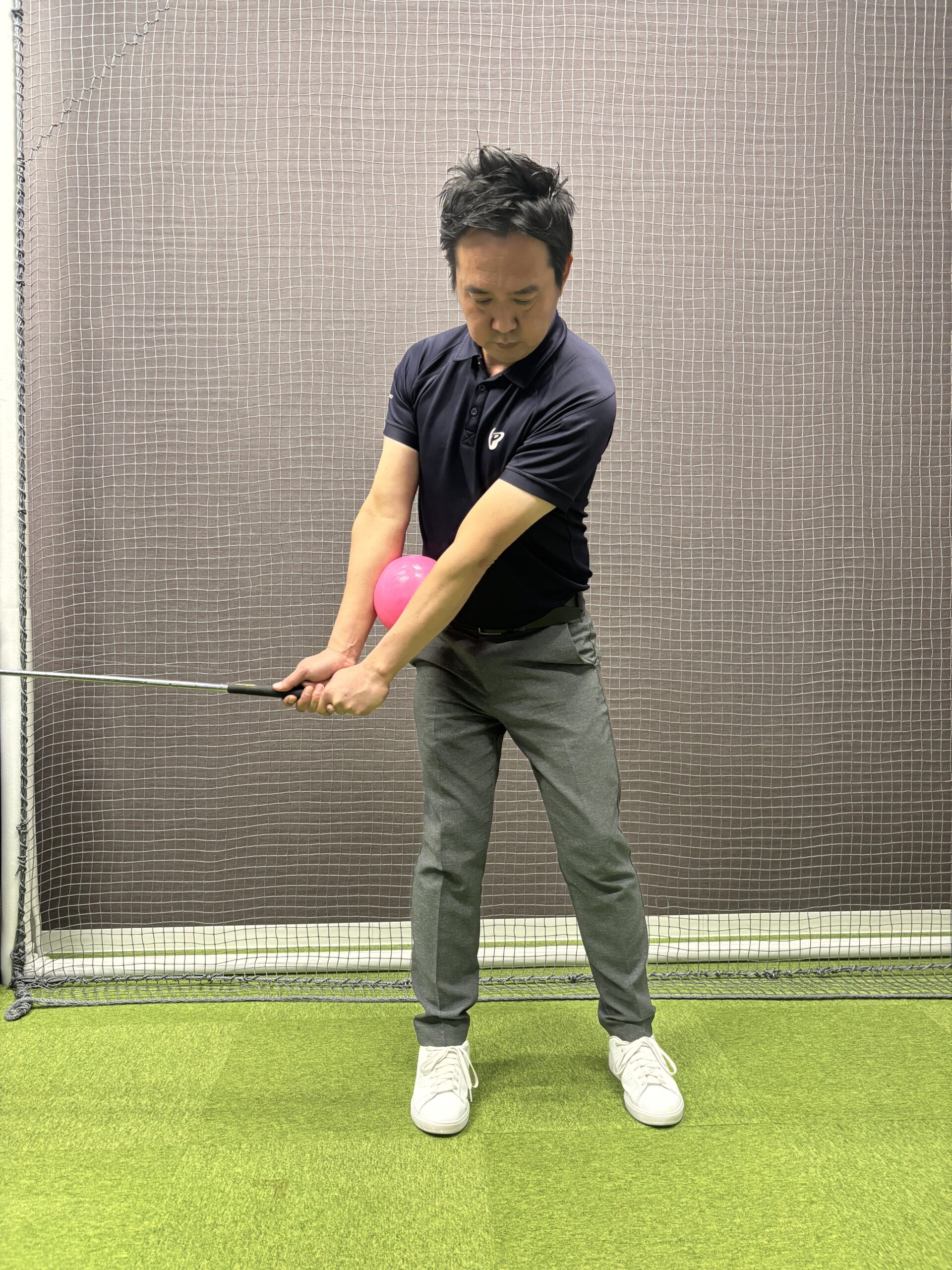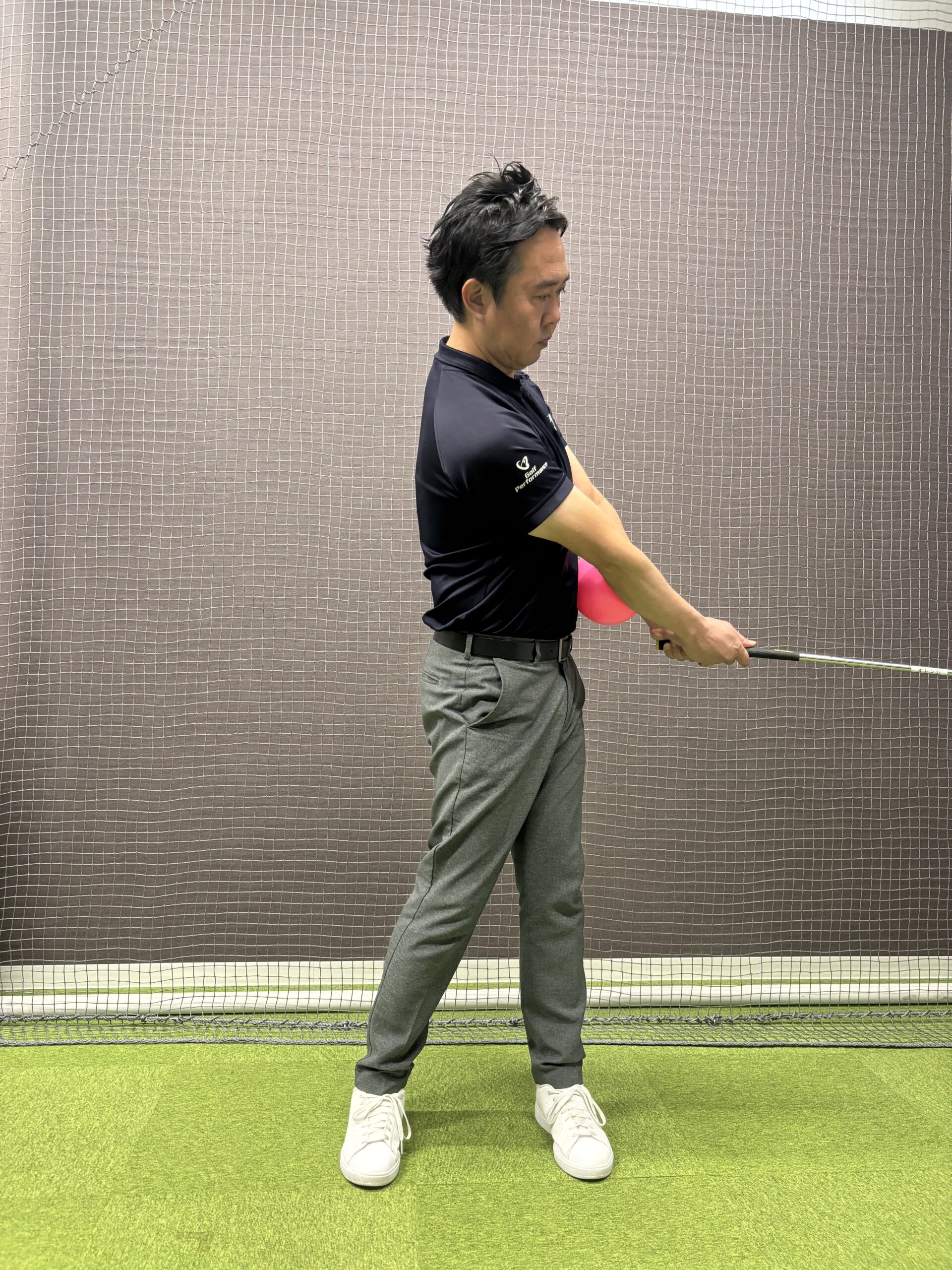 ボールを挟んで練習を続けていくと、自然と同調スイングが身についてきます。