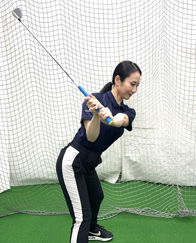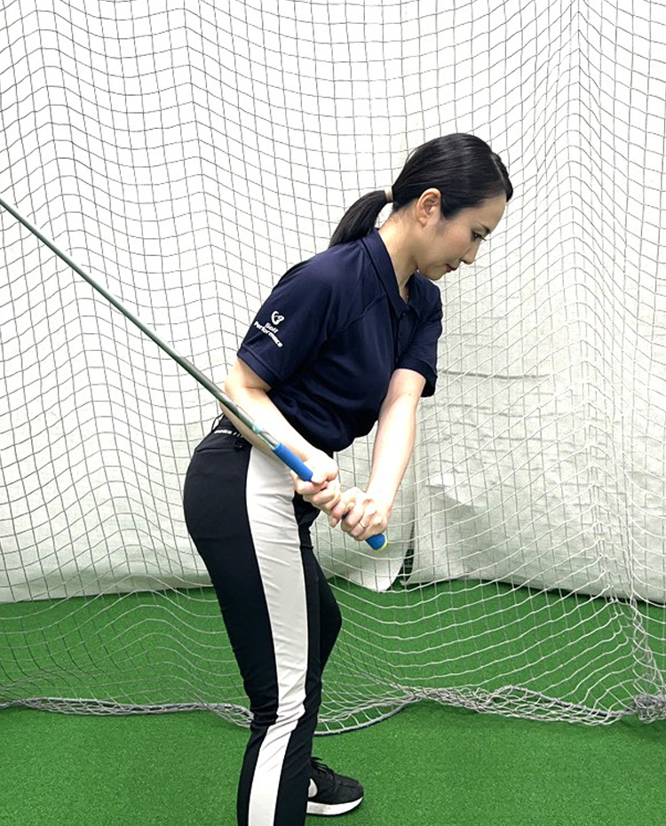 ・腰の⾼さ(ビジネスゾーン)までクラブを戻し、手⾸の角度が保たれているか確認