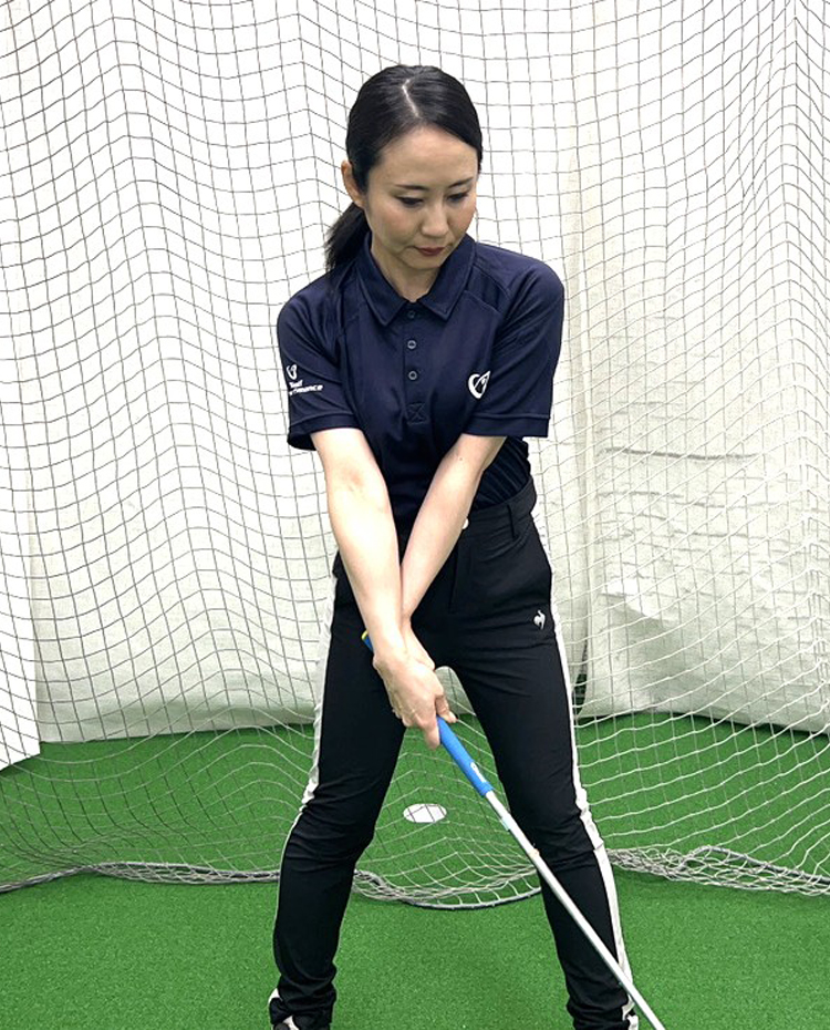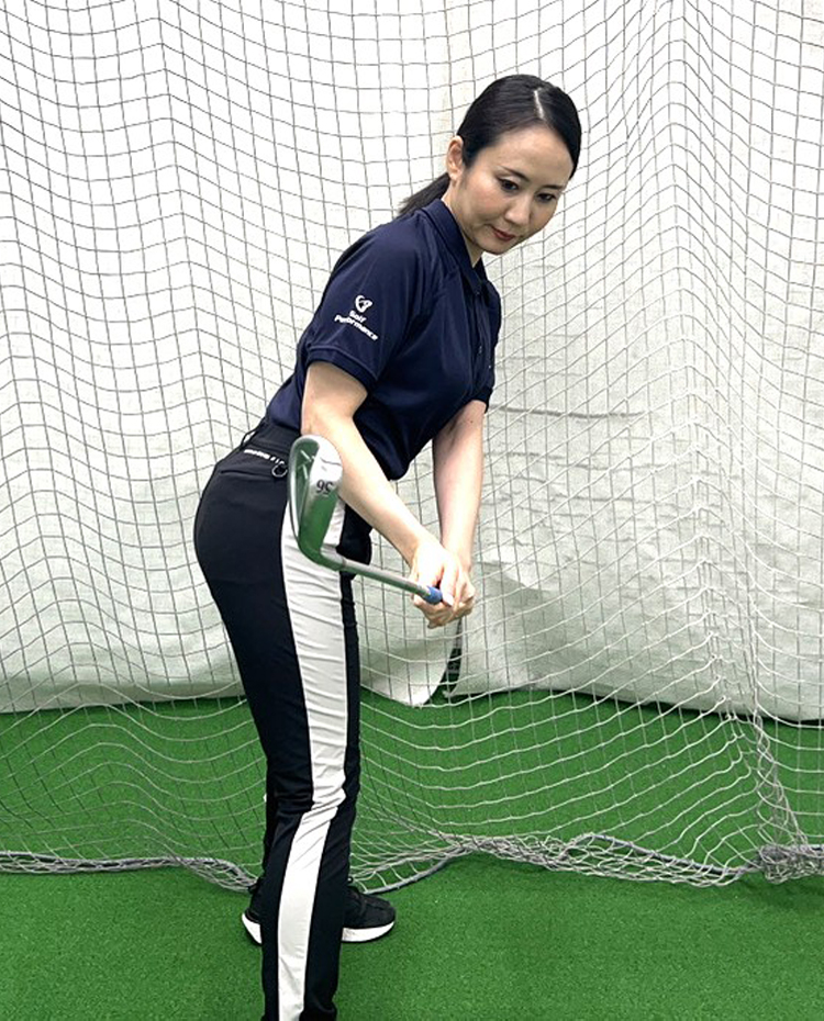 この練習法は、下半⾝リードでのダウンスイングを同時に⾝につけることができます。