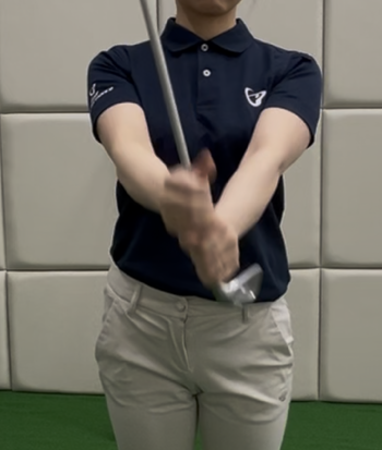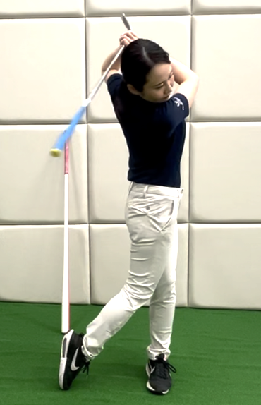 1.クラブを逆さに持ち、軽くした状態で素振りする。