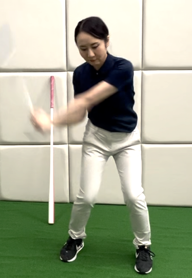 2.腕だけで振らず、腰の回転をしっかり使う。