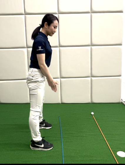 1.赤いスティックをボールからターゲットに向けて置き、ターゲットラインを明確にする。