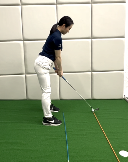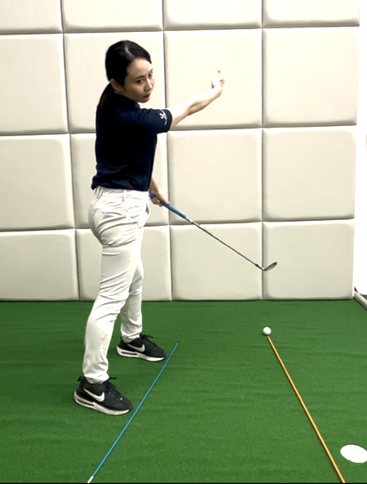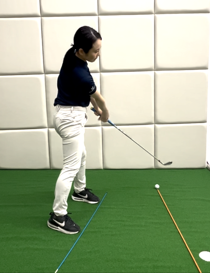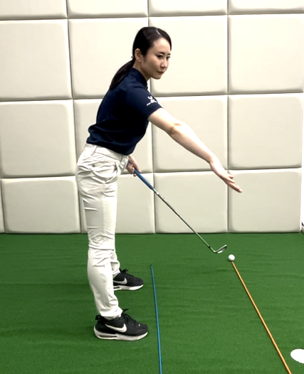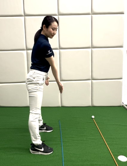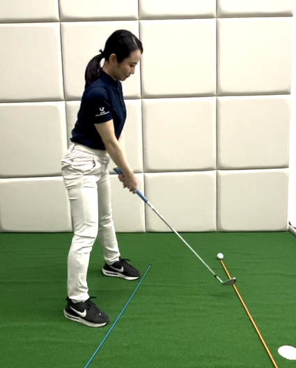 3.練習中は必ずフェースが赤いスティック(ターゲットライン)を向いているかチェック。