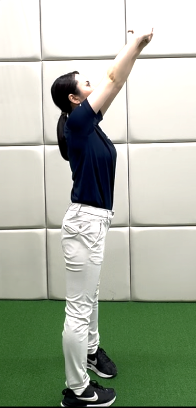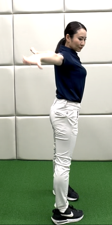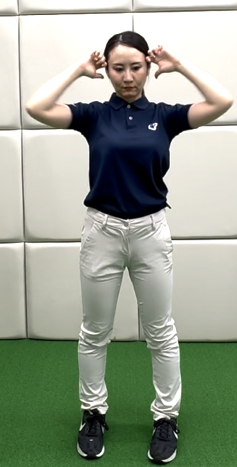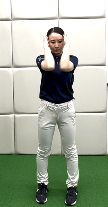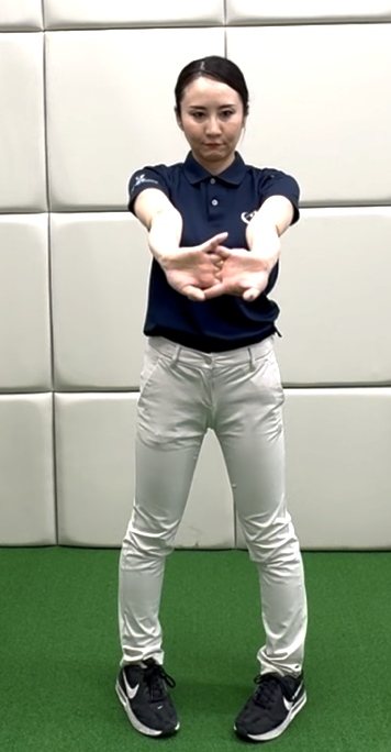 第1関節と第2関節の指を折り曲げゴルファーズグリップを作り肩の高さに手を広げる。